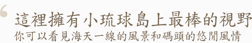 虹彩村民宿擁有小琉球島上最棒的視野,你可以在這裡看見海天一線的風景和民營交通船進出碼頭的悠閒風情。